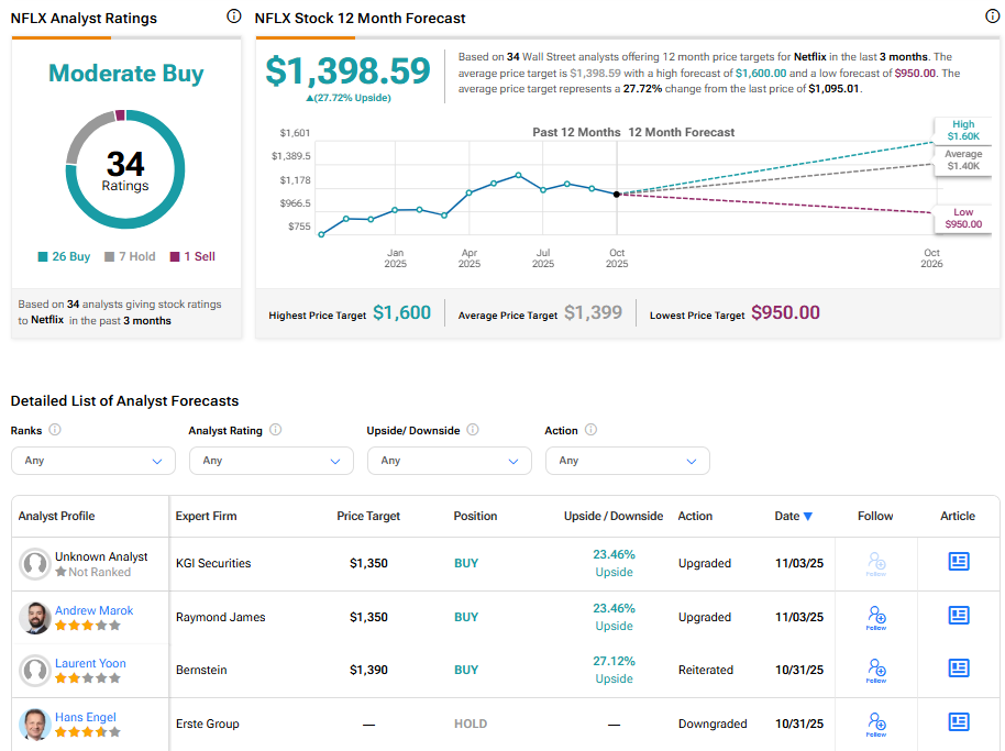 팁랭크스에서 NFLX 주식은 지난 3개월간 24건의 매수, 6건의 보유, 1건의 매도 의견을 받아 중립 매수 컨센서스 등급을 받았다. 넷플릭스 주가 목표가 평균은 1,402.19달러로, 현재 수준에서 28.09%의 상승 여력을 시사한다.
