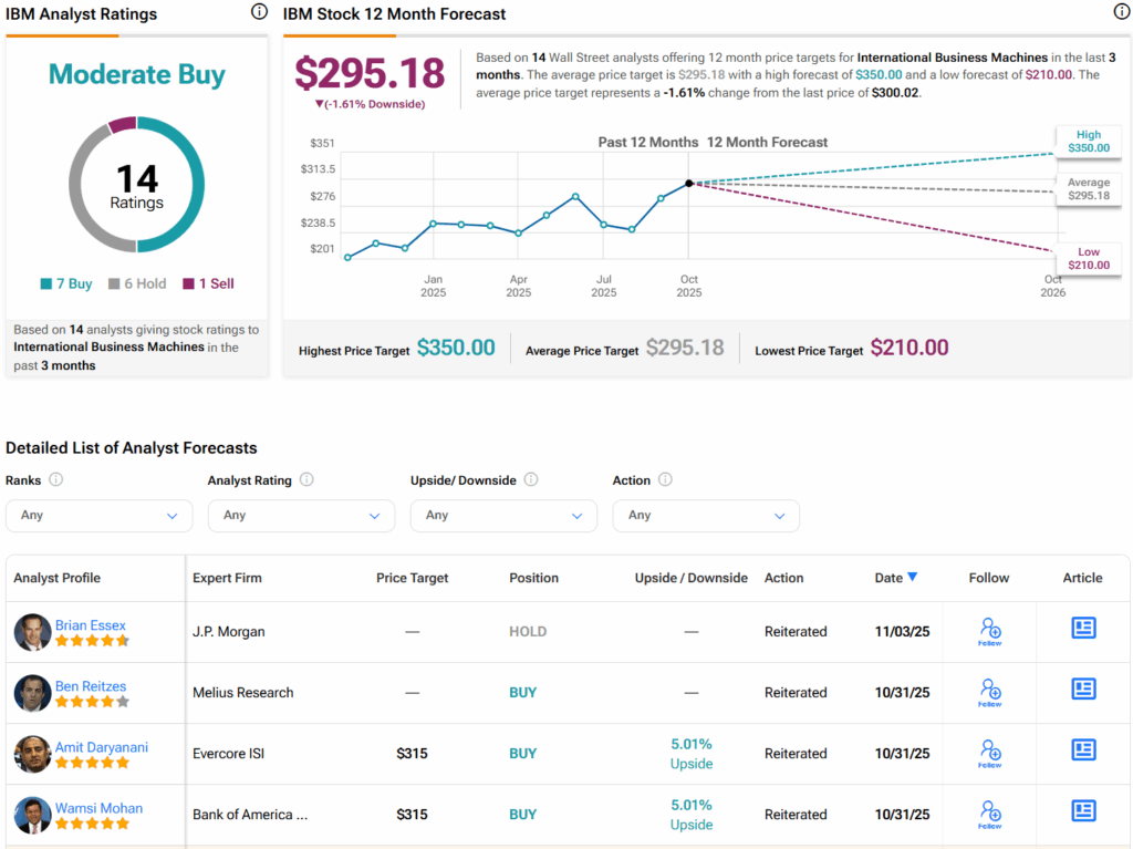 월가를 살펴보면, 애널리스트들은 지난 3개월간 매수 7건, 보유 6건, 매도 1건을 제시하며 IBM 주식에 대해 보통 매수 컨센서스 등급을 부여했다. 아래 그래프에서 확인할 수 있듯이, IBM의 평균 목표주가는 주당 295.18달러로 1.6%의 하락 여력을 시사한다.