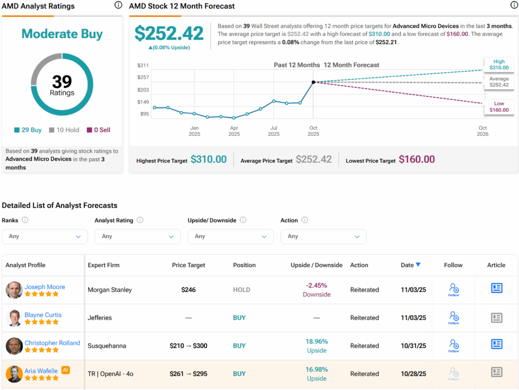 월가를 살펴보면, 애널리스트들은 AMD 주식에 대해 지난 3개월간 매수 29건, 보유 10건, 매도 0건을 부여하여 아래 그래픽에 표시된 바와 같이 보통 매수 컨센서스 등급을 제시하고 있다. 또한 주당 AMD 평균 목표주가 252.42달러는 주가가 적정 가치 수준에 근접해 있음을 시사한다. 그러나 오늘 실적 발표 이후 추정치가 변경될 가능성이 있다는 점은 주목할 만하다.