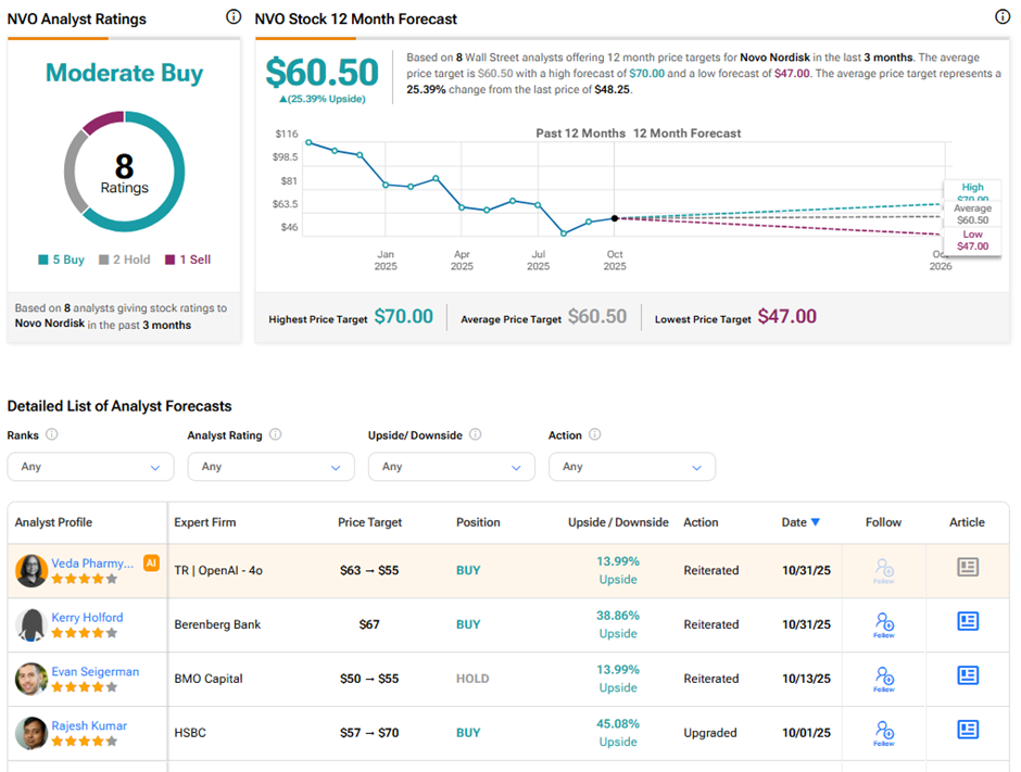 증권가는 노보 노디스크의 장기 전망에 대해 의견이 엇갈리고 있다. 팁랭크스에서 NVO 주식은 5건의 매수, 2건의 보유, 1건의 매도 의견을 바탕으로 보통 매수 컨센서스 등급을 받고 있다. 노보 노디스크의 평균 목표주가 60.50달러는 현재 수준에서 25.4%의 상승 여력을 시사한다.