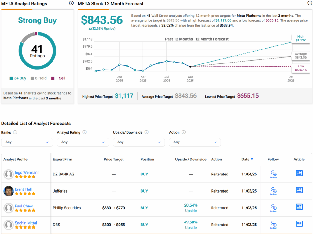 전반적으로 증권가는 META 주식에 대해 강력 매수 컨센서스 등급을 부여하고 있다. 아래 그래픽에서 볼 수 있듯이, 지난 3개월 동안 34건의 매수, 6건의 보유, 1건의 매도 의견이 제시되었다. 또한 META의 평균 목표주가는 주당 843.56달러로 32%의 상승 여력을 시사한다.