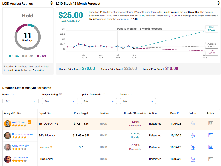 월가를 살펴보면, LCID 주식은 최근 3개월간 매수 1건, 보유 8건, 매도 2건의 의견을 바탕으로 보유 컨센서스 등급을 받고 있다. LCID의 평균 목표주가는 25.00달러로 현재 수준 대비 45.94%의 상승 여력을 시사한다.