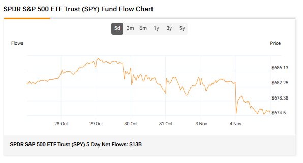 SPY의 5일 순유입액은 총 130억 달러로, 투자자들이 지난 5거래일 동안 SPY에 자금을 투입했음을 보여준다. 한편, 3개월 평균 거래량은 7,274만 주다.
