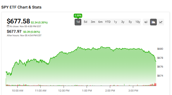 SPDR S&P 500 ETF Trust (SPY)는 수요일 0.35% 상승했는데, 이는 주로 예상보다 강한 ADP 민간 고용 보고서 덕분이었다. 한편, AI 주식의 밸류에이션에 대한 우려와 진행 중인 미국 정부 셧다운에 대한 불확실성이 계속해서 시장에 부담을 주었다.