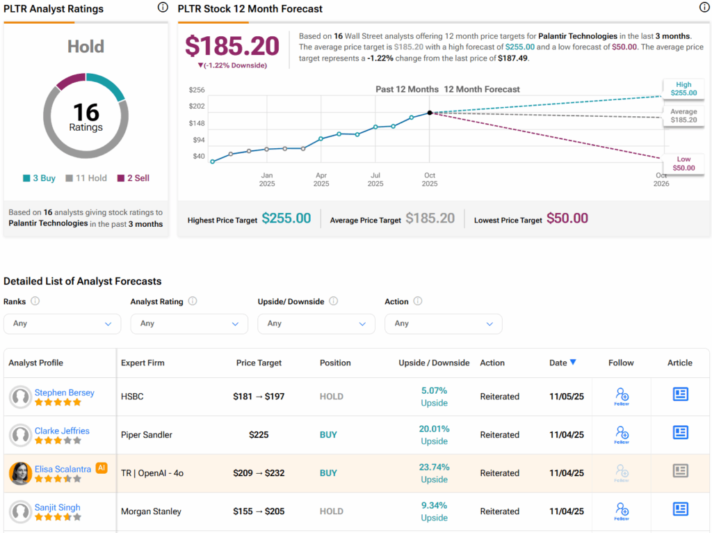 전반적으로 애널리스트들은 PLTR 주식에 대해 보유 컨센서스 등급을 부여하고 있으며, 이는 아래 그래픽에 표시된 바와 같이 지난 3개월 동안 매수 3건, 보유 11건, 매도 2건을 기반으로 한다. 또한 주당 평균 PLTR 목표주가 185.20달러는 주가가 적정 가치 근처에서 거래되고 있음을 시사한다.