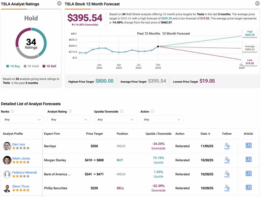 이 중요한 투표를 앞두고 증권가는 테슬라 주식에 대해 중립적 입장을 유지하고 있다. 팁랭크스에 따르면 TSLA 주식은 보유 컨센서스 등급을 받았으며, 최근 3개월간 매수 14건, 보유 10건, 매도 10건의 의견이 제시되었다. 테슬라 주식 평균 목표가는 395.54달러로, 현재 수준에서 14.4%의 하락 여력을 시사한다.