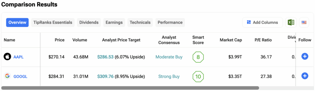 투자자들은 팁랭크스 주식 비교 도구에서 다양한 재무 지표와 애널리스트 평가를 기반으로 애플과 알파벳 주식을 나란히 비교할 수 있다. 자세한 내용은 아래 이미지를 클릭하면 확인할 수 있다.