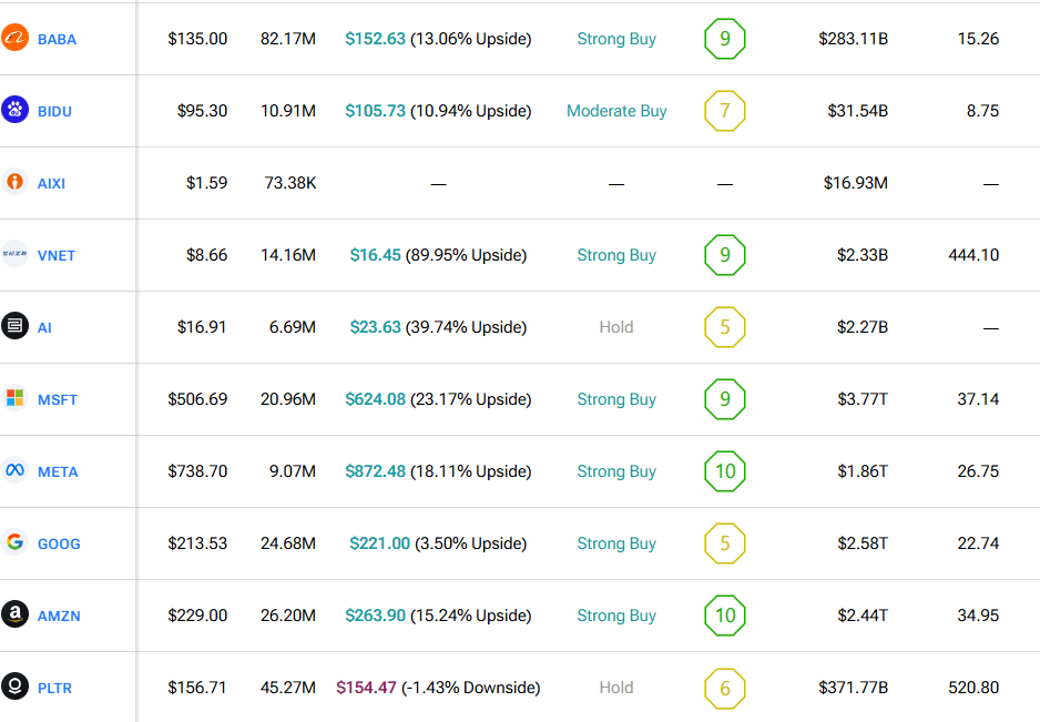 팁랭크스의 비교 도구를 사용하여 미국과 중국의 주요 AI 기업들을 나란히 배치해 각 주식에 대한 더 넓은 시각을 얻었다.