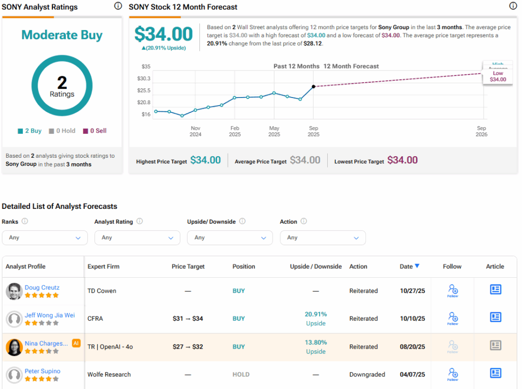 월가로 눈을 돌리면, 지난 3개월간 2건의 매수 의견을 바탕으로 한 소니에 대한 증권가의 컨센서스 등급은 보통 매수다. 이와 함께 소니 주식의 평균 목표주가는 34달러로, 회사 주가의 잠재적 상승 여력은 20.91%다.