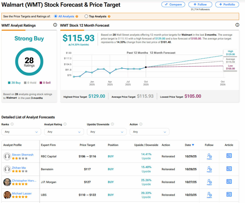 팁랭크스에서 WMT는 28개의 매수 등급을 기반으로 강력 매수 컨센서스를 받고 있다. 최고 목표주가는 129달러다. WMT 주식의 컨센서스 목표주가는 115.93달러로 14.33%의 상승 여력을 시사한다.