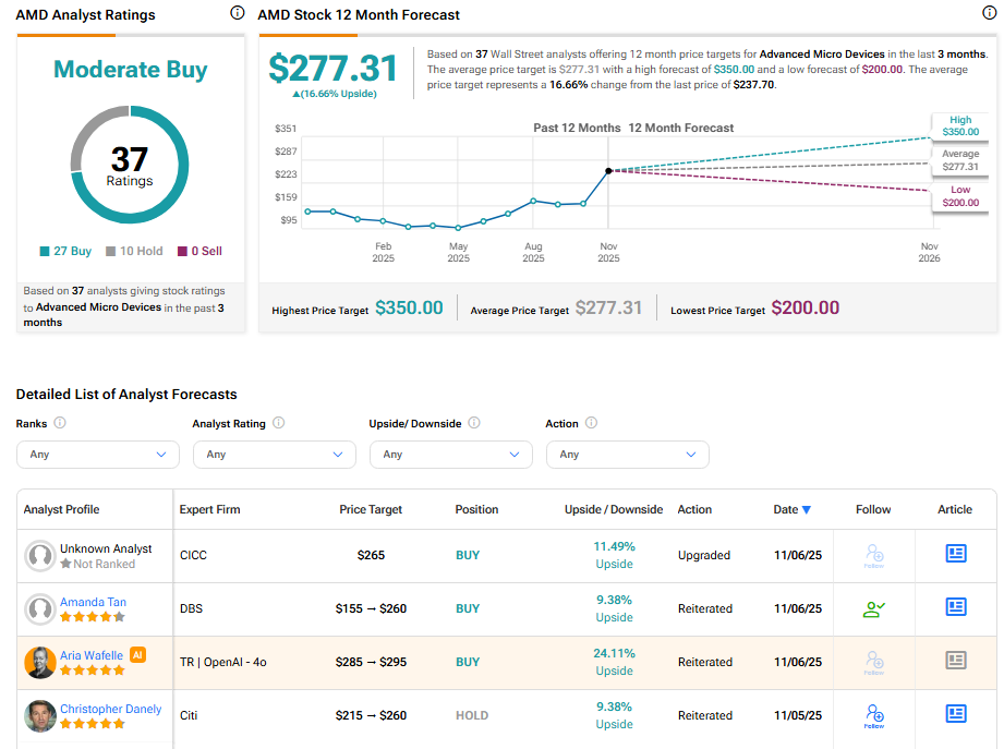 현재 월가는 어드밴스드 마이크로 디바이시스 주식에 대해 27건의 매수와 10건의 보유 의견을 바탕으로 보통 매수 컨센서스 등급을 부여하고 있다. AMD 주식의 평균 목표주가는 277.31달러로, 현재 수준에서 16.66%의 상승 여력을 시사한다.