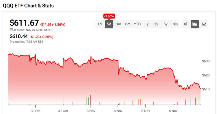 나스닥 100 지수(NDX)의 성과를 추종하는 QQQ ETF는 목요일 기술주와 인공지능(AI) 주식의 높은 밸류에이션에 대한 우려 속에 1.86% 하락했다.