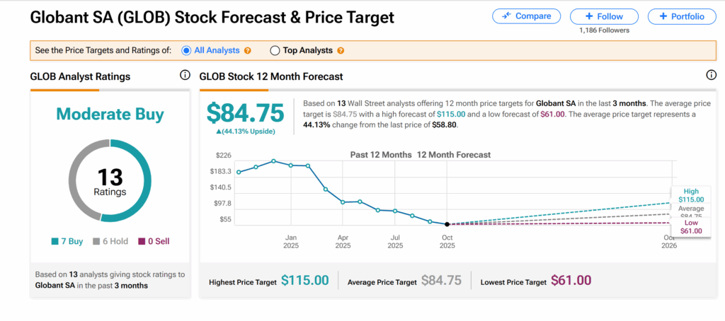 주당 84.75달러인 GLOB 평균 목표주가는 현재 거래 수준 대비 약 44%의 상승 여력을 시사한다.