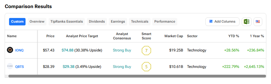 팁랭크스의 주식 비교 도구를 사용한 결과, 월가는 아이온큐와 QBTS 모두에 대해 적극 매수 컨센서스를 유지하고 있다. 아이온큐가 더 높은 상승 잠재력을 제공하는데, 증권가의 평균 목표주가는 74.88달러로 향후 12개월간 약 30%의 상승 여력을 시사한다. 이에 비해 디웨이브의 평균 목표가는 29.38달러로 현재 수준에서 3.5%의 완만한 상승 여력을 제시한다.