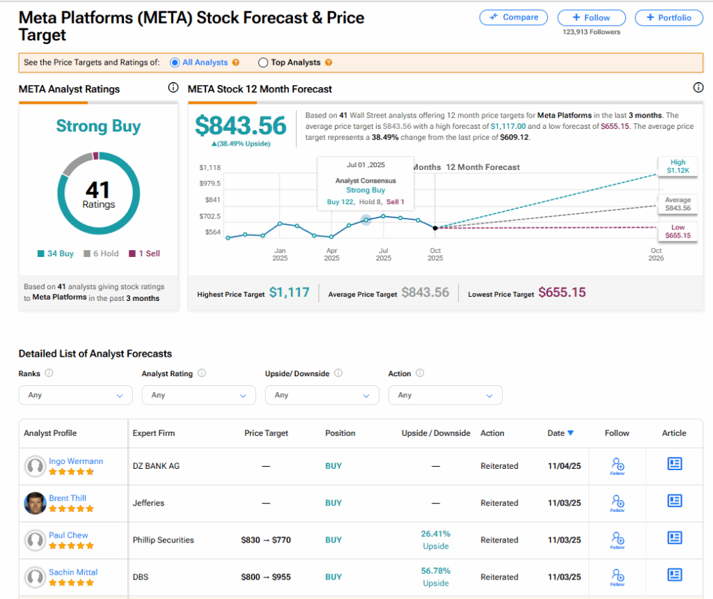 메타 플랫폼스 주식은 월가 애널리스트 41명 사이에서 적극 매수 컨센서스 등급을 받고 있다. 이 등급은 지난 3개월간 발표된 매수 34건, 보유 6건, 매도 1건의 의견을 기반으로 한다. 평균 META 목표주가는 843.56달러로 현재 수준 대비 38.49% 상승 여력을 시사한다.