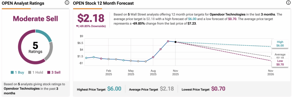 팁랭크스 데이터에 따르면 오픈도어 테크놀로지스 (OPEN)는 최근 5명의 애널리스트 리뷰를 바탕으로 "보통 매도" 컨센서스 등급을 받고 있다. 세부 내역은 매수 1건, 보유 1건, 매도 3건으로 구성된다.