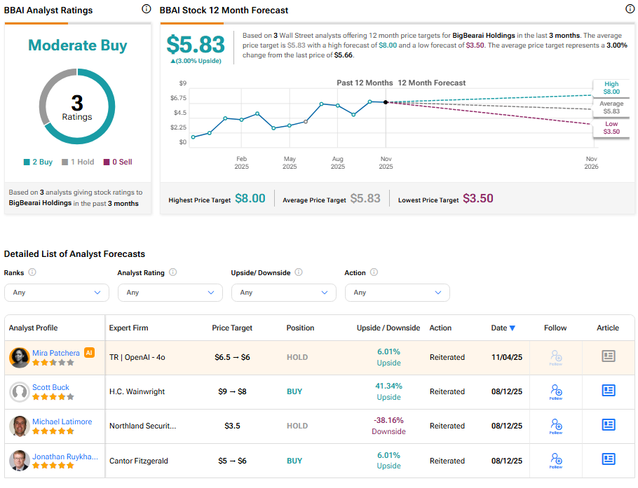 전반적으로 BigBear.ai Holdings 주식은 2건의 매수와 1건의 보유 의견을 바탕으로 적극 매수 컨센서스 등급을 받고 있다. BBAI 주식의 평균 목표주가 5.83달러는 3%의 상승 여력을 시사한다.