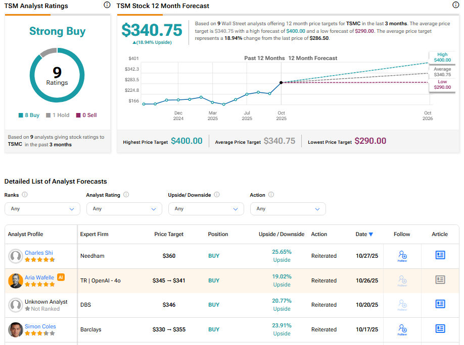 월가에서 TSM은 최근 3개월간 8건의 매수와 1건의 보유 의견을 받아 강력 매수 컨센서스 등급을 기록하고 있다. TSMC의 평균 목표주가는 340.75달러로 18.94%의 상승 여력을 시사한다.