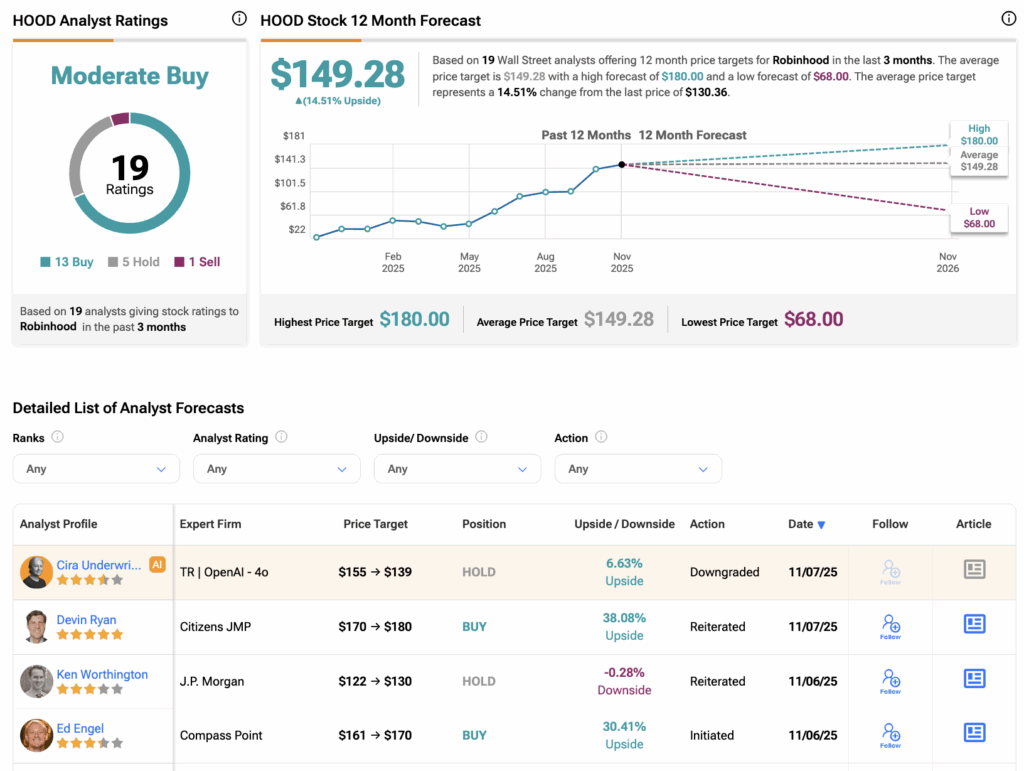 팁랭크스 컨센서스에 따르면, HOOD 주식은 최근 3개월간 13건의 매수, 5건의 보유, 1건의 매도 의견을 받아 중간 매수 등급을 받았다. 로빈후드 마켓츠 목표주가 149.28달러는 현재 거래 수준 대비 14.5%의 상승 여력을 시사한다.