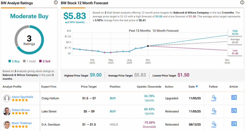 Babcock & Wilcox는 월가에서 보통 매수 컨센서스 등급을 받고 있으며, 매수 2건과 보유 1건을 포함한 3건의 리뷰를 기반으로 한다. 주식의 현재 가격은 5.61달러이며, 평균 목표주가 5.83달러는 향후 1년간 4%의 소폭 상승을 시사한다. (BW 주가 전망 참조)