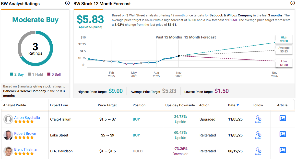 이 주식은 Craig-Hallum의 Aaron Spychalla가 커버하고 있으며, 그는 TipRanks에서 월가 전문가 상위 3%에 속하는 5성급 애널리스트로 평가받고 있다. Spychalla는 회사의 AI 데이터 센터 부문으로의 전환에 내재된 잠재력을 좋아하며, 3분기 실적 이후 다음과 같이 썼다. "더 주목할 만한 것은 Applied Digital AI 공장을 위한 1기가와트(GW)의 천연가스 전력에 대해 BW의 보일러 및 관련 증기 터빈을 활용하는 Applied Digital과의 15억 달러 이상 계약에 대한 제한적 진행 통지 서명이었다. 여전히 최종 진행 통지(2026년 1분기 예상)가 필요하지만, 이것은 약 6억 달러 규모의 사업에 있어 분명히 상당한 발전이며, 우리는 BW가 기저부하 발전을 더 빠르게 온라인으로 가져와 현재 시장의 주요 병목 현상을 완화하는 데 도움을 줄 수 있는 잠재력을 보여준다고 생각한다. 이것은 또한 최근 발표된 Denham Capital과의 파트너십을 기반으로 하며, 미국과 유럽의 데이터 센터에 전력을 공급하기 위해 기존 석탄 발전소를 전환하는 것으로, BW는 30억 달러 이상의 AI/데이터 센터 파이프라인을 언급했다. 이 모든 것 가운데, 자산 매각이 부채 상환으로 이어지면서 대차대조표가 계속 개선되고 있다."