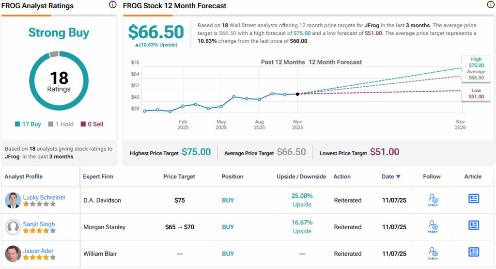 FROG에 대한 최근 애널리스트 리뷰는 18건이 있으며, 17대 1로 매수가 보유를 압도하여 강력 매수 컨센서스 등급을 받았다. 주식은 현재 60달러에 거래되고 있으며, 평균 목표주가 66.50달러는 향후 1년간 11%의 상승 잠재력을 시사한다. (FROG 주가 전망 참조)