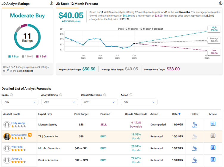 현재 월가는 JD닷컴 주식에 대해 9건의 매수, 1건의 보유, 1건의 매도 의견을 바탕으로 보통 매수 컨센서스 등급을 부여하고 있다. JD 주식의 평균 목표주가는 40.05달러로 현재 수준 대비 26% 상승 여력을 시사한다.
