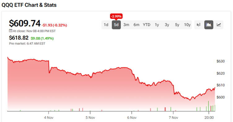 나스닥 100 지수(NDX)의 성과를 추종하는 QQQ ETF는 금요일 기술주와 인공지능(AI) 주식의 높은 밸류에이션에 대한 우려로 0.32% 하락했다.