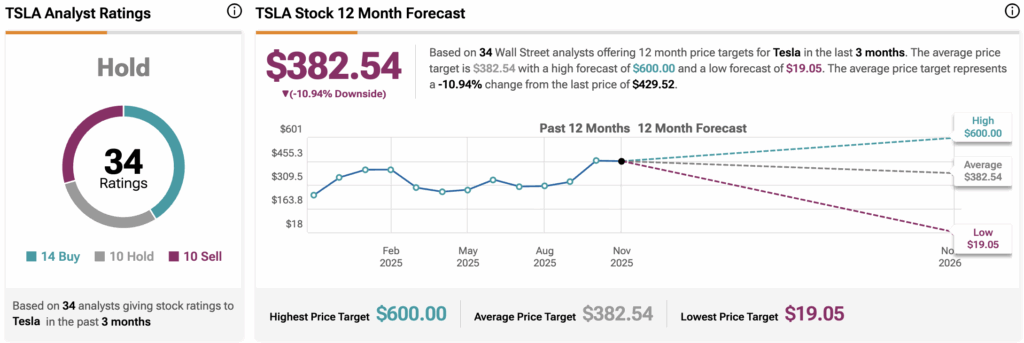 팁랭크스에 따르면, 테슬라 주식은 지난 3개월 동안 14건의 매수, 10건의 보유, 10건의 매도 의견을 받아 보유 컨센서스 등급을 받았다. 평균 12개월 테슬라 주가 목표는 382.54달러로, 현재 수준에서 11%의 하락 가능성을 시사한다.