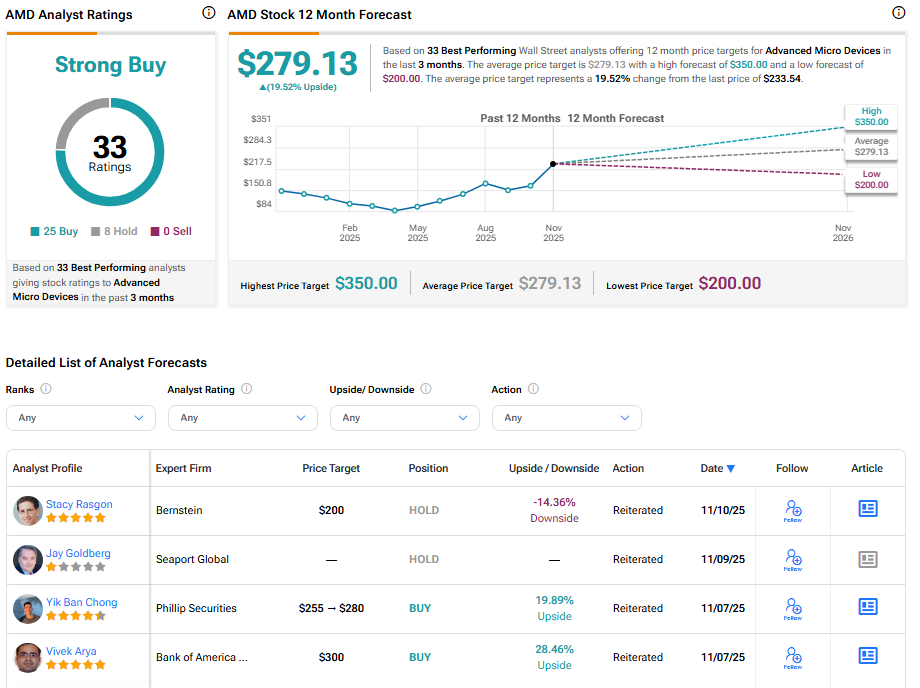 현재 월가는 어드밴스드 마이크로 디바이시스 주식에 대해 27건의 매수와 10건의 보유 의견을 바탕으로 중립적 매수 컨센서스 등급을 부여하고 있다. AMD 주식의 평균 목표주가 277.31달러는 현재 수준에서 16.66%의 상승 여력을 시사한다.