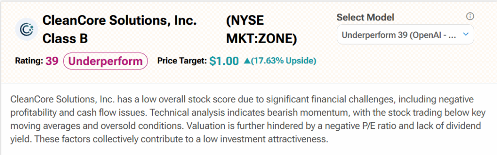 월가로 눈을 돌리면, 클린코어에 대한 애널리스트 커버리지는 부족하다. 다행히 팁랭크스의 AI 애널리스트 스파크가 이를 다루고 있다. 스파크는 ZONE 주식에 대해 비중축소(39점) 의견과 목표주가 1달러를 제시했다. 스파크는 이러한 입장의 이유로 "마이너스 수익성과 현금흐름 문제를 포함한 심각한 재무적 어려움"을 언급했다.