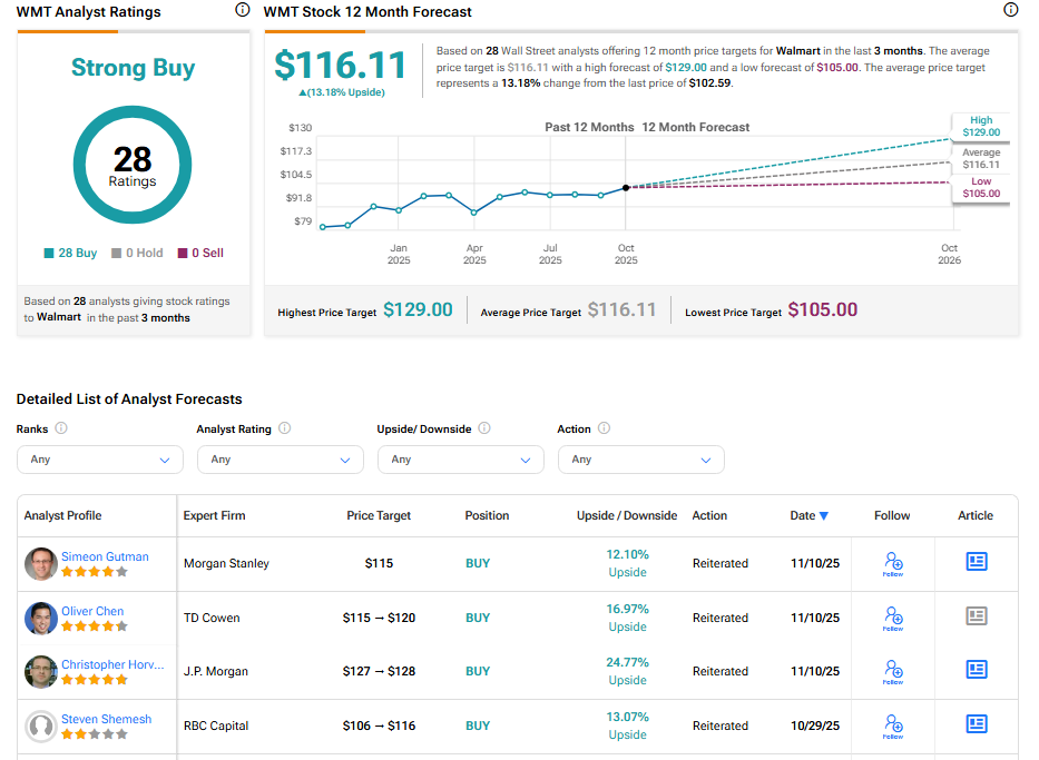 현재 월가는 28건의 매수 의견을 바탕으로 월마트 주식에 대해 강력 매수 컨센서스 등급을 부여하고 있다. 평균 월마트 목표주가 116.11달러는 현재 수준 대비 13.18%의 상승 여력을 시사한다.