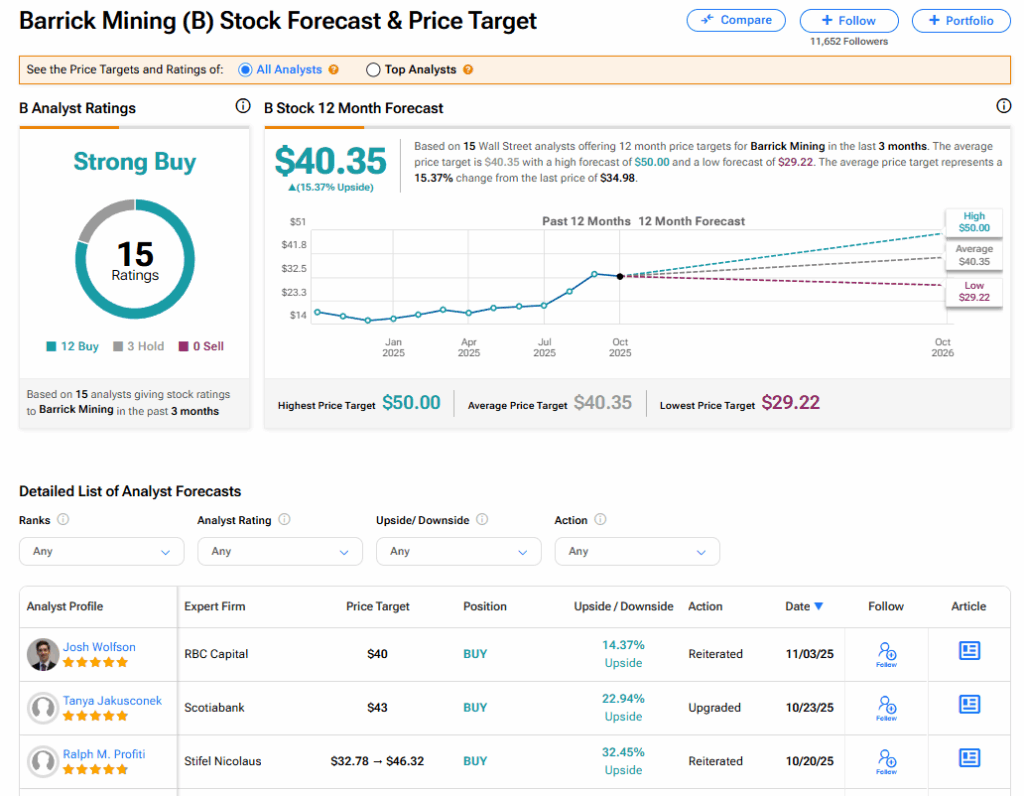배릭 마이닝 주식은 월가 애널리스트 15명 사이에서 적극 매수 의견을 받고 있다. 이 등급은 최근 3개월간 발표된 매수 12건과 보유 3건의 의견을 기반으로 한다. B 주식의 평균 목표주가는 40.35달러로 현재 수준 대비 14.37% 상승 여력을 시사한다.