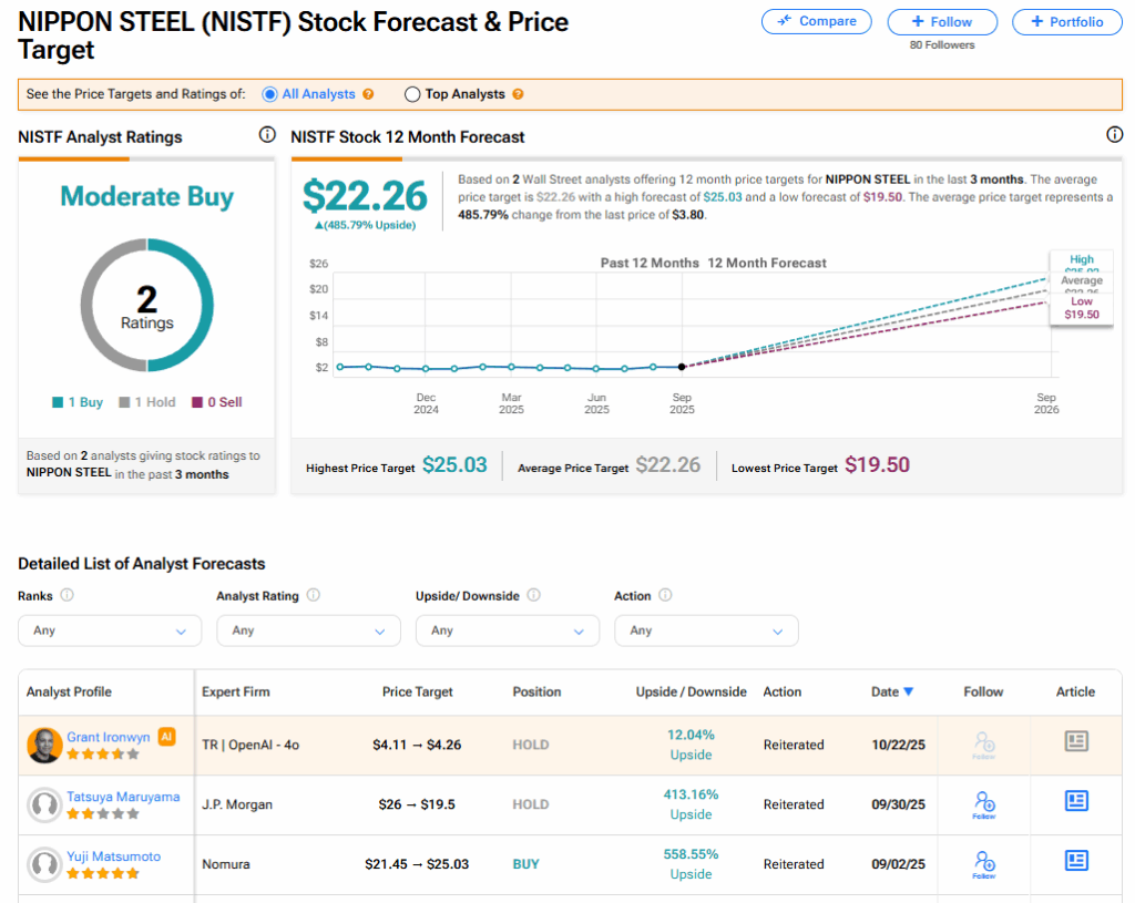 닛폰제철은 월가 애널리스트 2명으로부터 보통 매수 등급을 받았다. 이 등급은 최근 3개월간 발표된 매수 1건과 보유 1건의 의견을 기반으로 한다. NISTF의 평균 목표주가 22.26달러는 현재 수준 대비 485% 상승 여력을 시사한다.