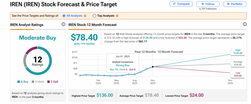 그러나 평균 IREN 목표주가인 78.40달러는 현재 거래 수준에서 거의 25%의 상승 여력을 시사한다.