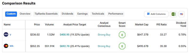 월가로 눈을 돌리면, 비자와 마스터카드 주식 모두 적극 매수 컨센서스 등급을 받고 있다. 또한 증권가는 MA 주식에서 25.4%, 비자 주식에서 19.3%의 상승 여력을 전망하고 있다.