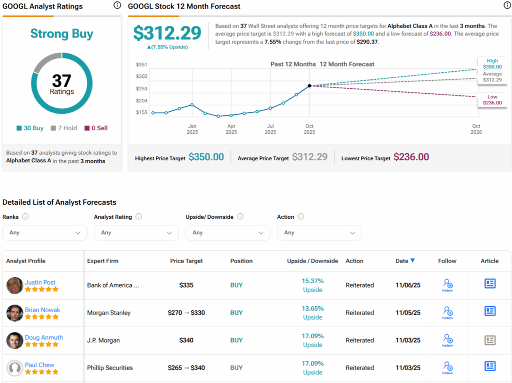 월가로 눈을 돌리면, 애널리스트들은 지난 3개월간 30건의 매수와 7건의 보유 의견을 바탕으로 GOOGL 주식에 대해 강력 매수 컨센서스 등급을 부여했다. 또한 주당 평균 GOOGL 목표주가 312.29달러는 7.6%의 상승 여력을 시사한다.