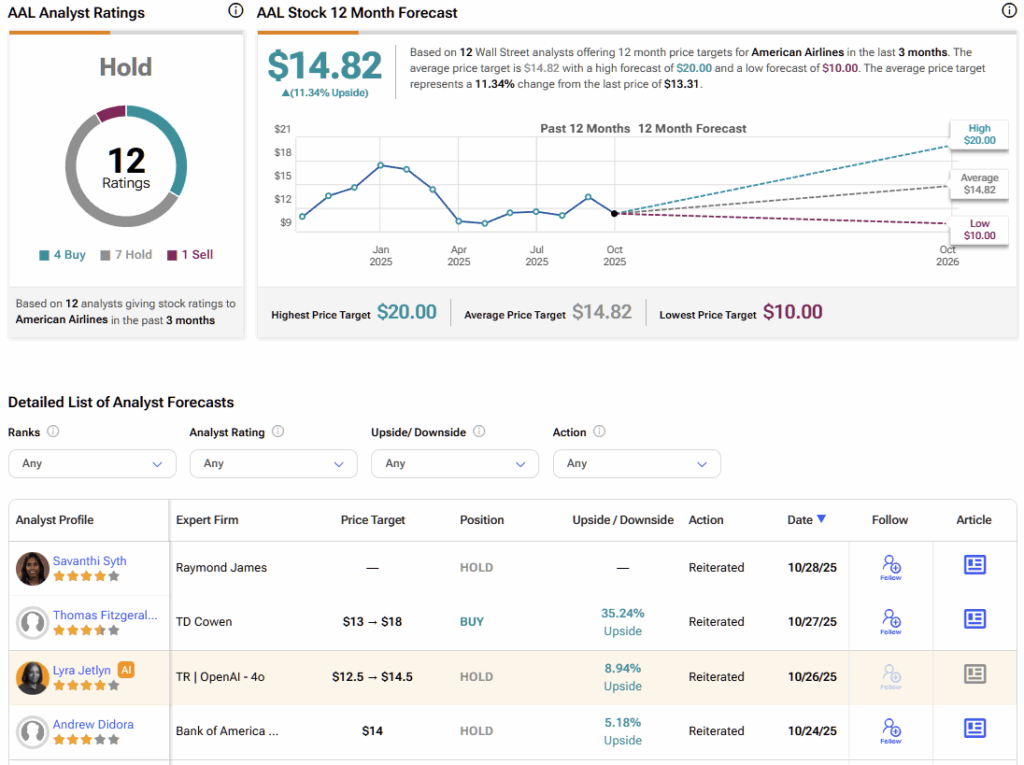 월가로 눈을 돌리면 AAL 주식은 보유 컨센서스 등급을 받고 있으며, 이는 4개의 매수, 7개의 보유, 1개의 매도 등급을 기반으로 한다. AAL의 평균 목표 주가는 $14.82로, 향후 12개월 동안 8.57%의 상승 여력을 시사한다.