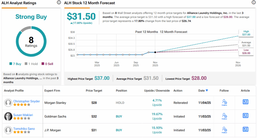 IPO 이후 얼라이언스는 8건의 애널리스트 리뷰를 받았다. 매수 7건, 보유 1건으로 나뉘어 적극 매수 컨센서스 등급을 뒷받침한다. 주식의 현재 거래가 26.74달러와 평균 목표주가 31.50달러는 향후 12개월간 18%의 상승을 시사한다. (ALH 주가 전망 참조)