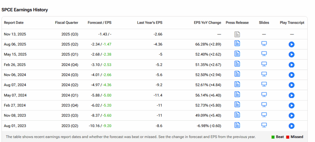 월가는 SPCE가 3분기 주당순손실 1.43달러를 기록할 것으로 예상하고 있으며, 이는 작년 같은 기간 2.66달러 손실과 비교된다. 매출은 31만5000달러로 2024년 같은 기간 40만 달러에서 감소할 것으로 전망된다. SPCE가 이러한 추정치를 상회할 수 있을까? 아래에서 볼 수 있듯이 최근 실적 서프라이즈 기록은 양호한 편이다.