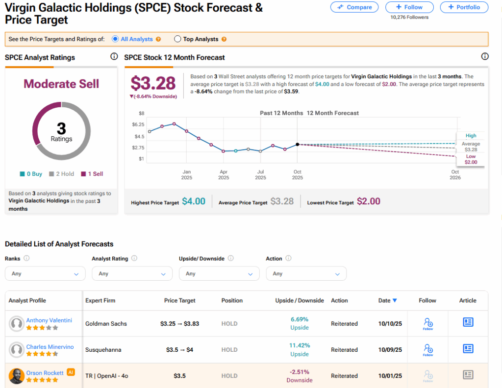 팁랭크스에서 SPCE는 보유 의견 2개와 매도 의견 1개를 기반으로 중립적 매도 컨센서스를 받고 있다. 최고 목표주가는 4달러다. SPCE 주식의 컨센서스 목표주가는 3.28달러로 8.64% 하락 여력을 시사한다.