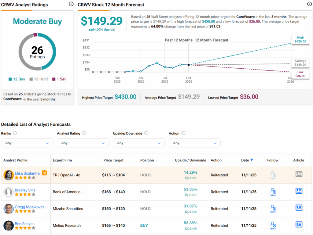 월가를 보면, 애널리스트들은 CRWV 주식에 대해 보통 매수 의견을 제시하고 있다. 아래 그래픽에서 보듯이 지난 3개월간 매수 12건, 보유 13건, 매도 1건이 나왔다. 또한 CRWV의 평균 목표주가는 주당 149.29달러로 64%의 상승 여력을 시사한다.