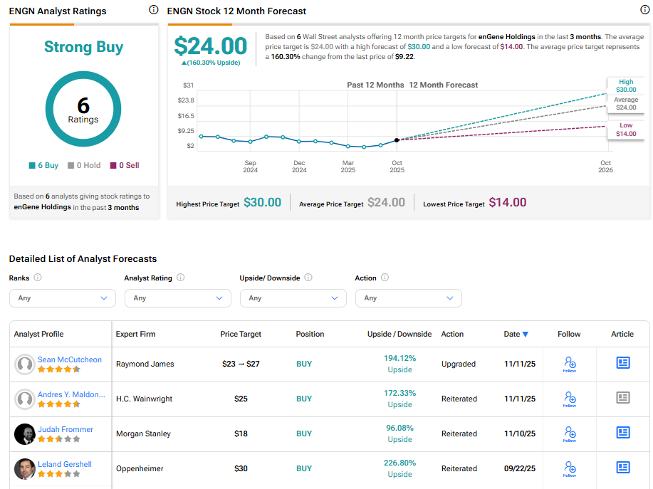 월가로 눈을 돌리면, ENGN 주식은 최근 3개월간 6건의 매수 의견을 받아 강력 매수 컨센서스 등급을 기록하고 있다. 24.00달러인 엔진 평균 목표주가는 160.30%의 상승 여력을 시사한다.