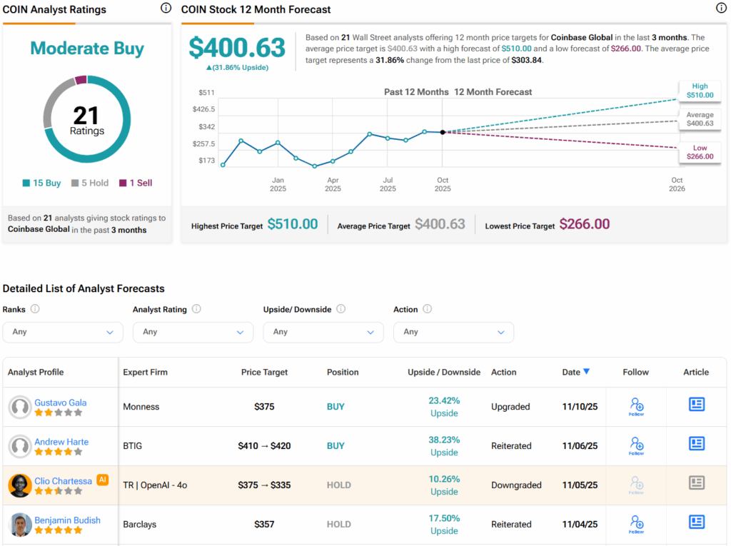 월가 증권가는 코인베이스 주식에 대해 보통 매수 의견을 제시하고 있다. 최근 3개월간 15건의 매수, 5건의 보유, 1건의 매도 의견이 나왔다. 또한 코인베이스의 평균 목표주가는 주당 400.63달러로 31.9%의 상승 여력을 시사한다.