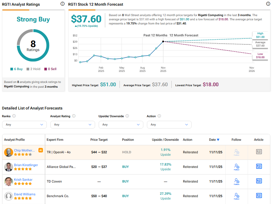 리게티 컴퓨팅 주식은 월가 애널리스트 8명으로부터 적극 매수 컨센서스 의견을 받고 있다. 이 평가는 최근 3개월간 발표된 매수 6건, 보유 2건의 의견을 기반으로 한다. 평균 RGTI 목표주가 37.60달러는 현재 수준 대비 19.75% 상승 여력을 시사한다.