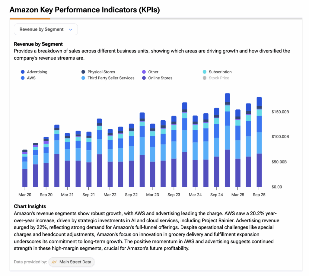 2025년 3분기 아마존의 구독 수익은 전년 대비 11% 증가하여 125억 7,000만 달러를 기록했다. 특히 회사의 구독 수익은 주로 연간 및 월간 프라임 멤버십 수수료를 포함한다. 또한 영화, TV 프로그램, 오디오북, 음악, 전자책 및 기타 비AWS 구독과 같은 디지털 콘텐츠로부터의 수익도 포함한다. 아래는 아마존의 다양한 부문별 수익 분석을 보여주는 스크린샷이다.