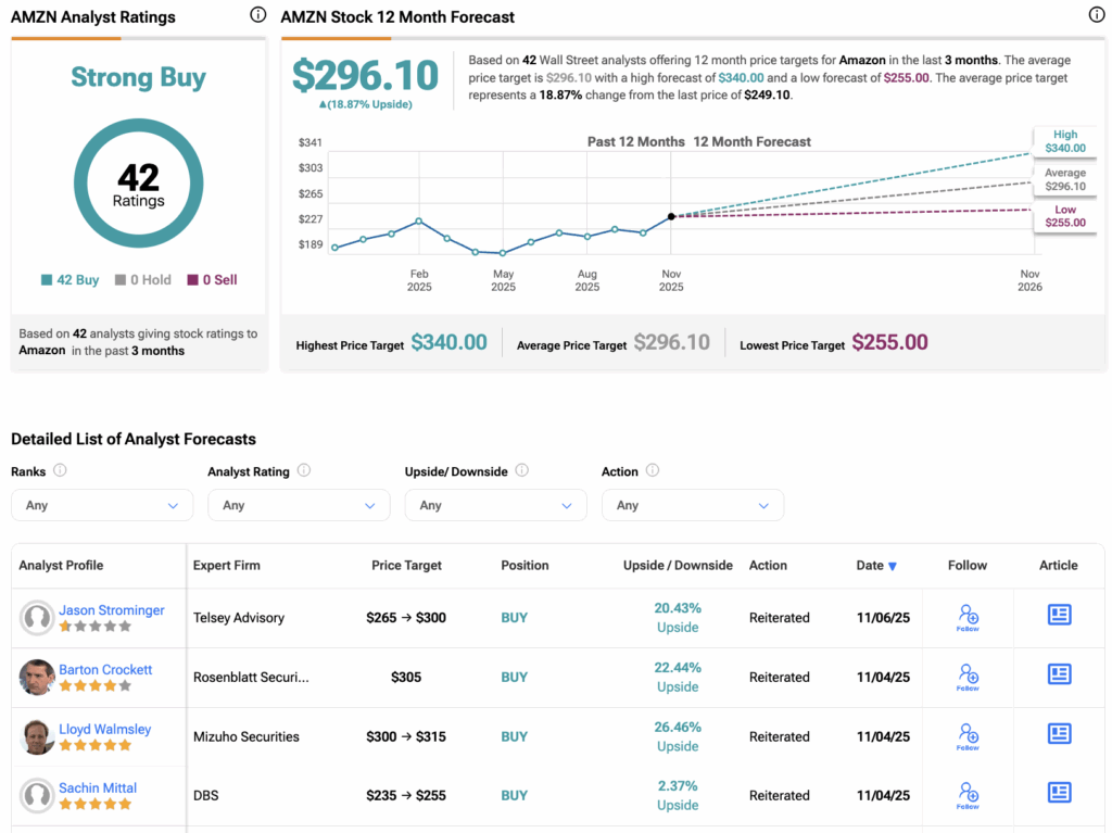 팁랭크스에 따르면 AMZN 주식은 지난 3개월간 42건의 매수 의견을 받아 강력 매수 컨센서스 등급을 받았다. 296.10달러의 아마존 평균 목표주가는 현재 수준에서 19%의 상승 여력을 시사한다.