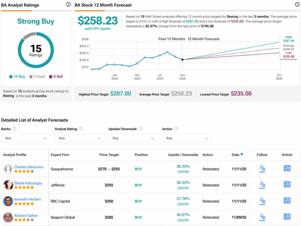 월가에서는 지난 3개월간 13건의 매수와 2건의 보유 의견이 나오면서, 아래 그래픽에서 보듯이 BA 주식에 대해 강력 매수 컨센서스 투자의견을 제시하고 있다. 지난 1년간 주가가 39.47% 상승한 후, 주당 평균 BA 목표주가 258.23달러는 32.37%의 상승 여력을 시사한다.