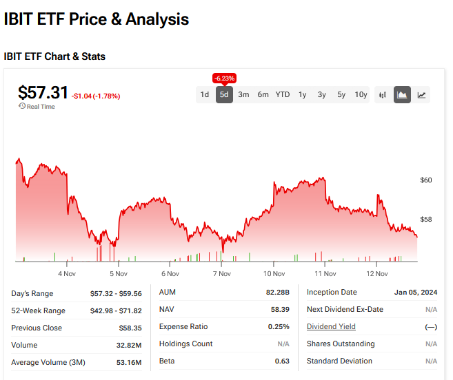 오늘 IBIT는 1.54% 하락한 57.45달러를 기록했다. 주된 하락 요인은 비트코인 가격으로, 1.68% 하락한 101,288.42달러를 기록했다.