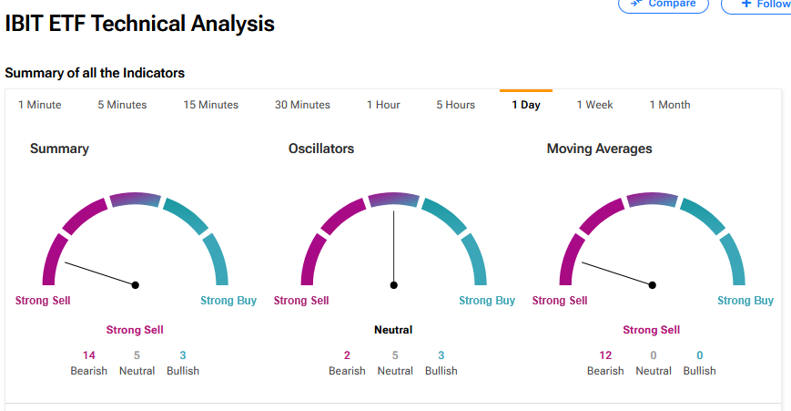 팁랭크스의 기술적 분석에 따르면, IBIT는 현재 약세 14개, 중립 5개, 강세 3개 등급을 기록하며 강한 매도 컨센서스를 나타내고 있다.